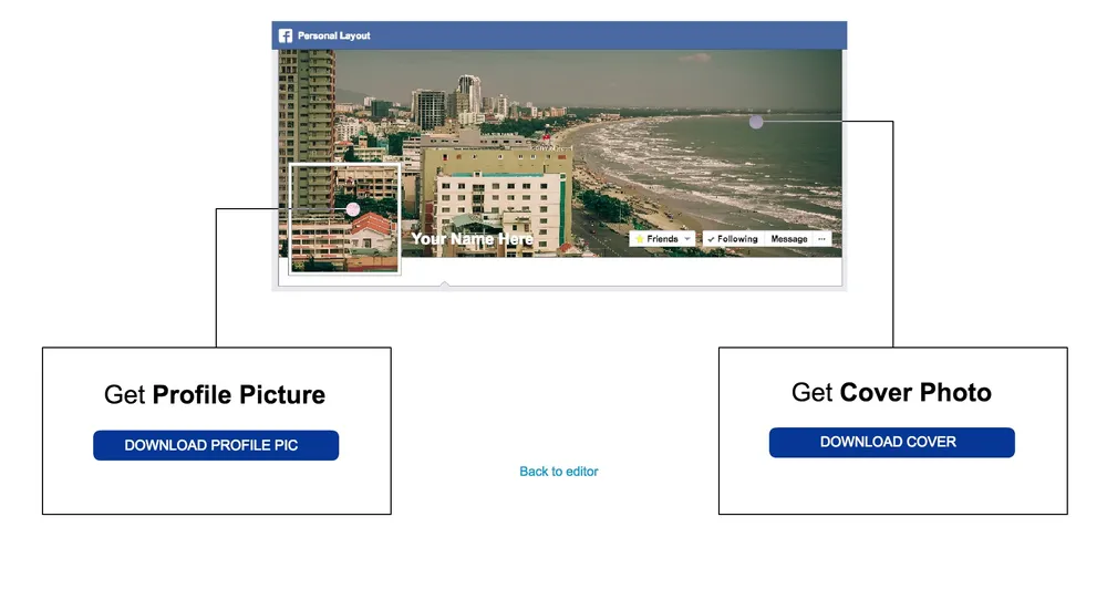 - Bước 4: Nếu đã ưng ý, người dùng chỉ cần nhấp vào tùy chọn Download Profile Pic và Download Cover để tải về ảnh đại diện, ảnh bìa Facebook mới. Ngược lại, khi cần chỉnh sửa, bạn hãy nhấn Back to editor.