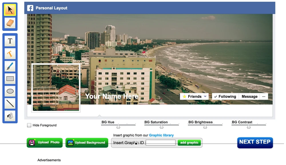 - Bước 2: Tại đây, bạn sẽ có hai lựa chọn gồm Upload Photo (tải ảnh lên và tự chỉnh sửa kích thước) hoặc Upload Background (tải ảnh và mọi thứ sẽ do chương trình tự canh chỉnh). Lưu ý, bạn nên sử dụng ảnh ngang có độ phân giải lớn để tránh bị méo hình. Ngoài ra còn rất nhiều công cụ khác mà người dùng có thể tự khám phá thêm như vẽ hình, tẩy xóa, thêm chữ...