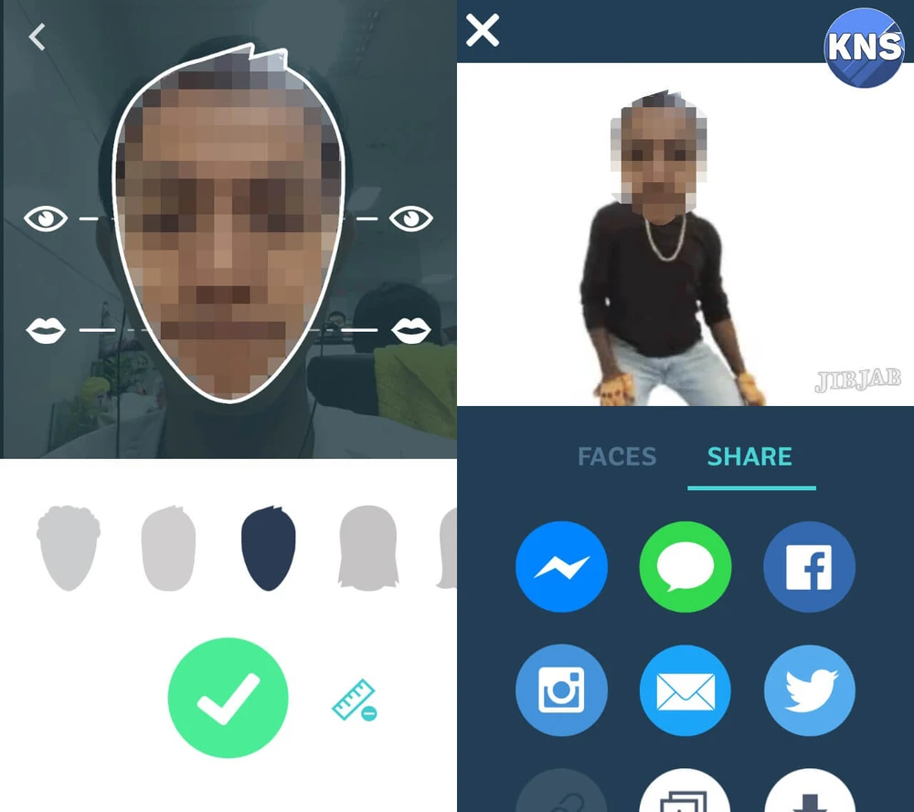 - Bước 2: Tiếp theo, bạn mở ứng dụng và cấp quyền cho phép JibJab truy cập thư viện, camera… Để bắt đầu, bạn cần chụp lại khuôn mặt của mình, sau đó canh chỉnh vùng mắt và miệng sao cho phù hợp với các mẫu (nam/nữ) có sẵn.