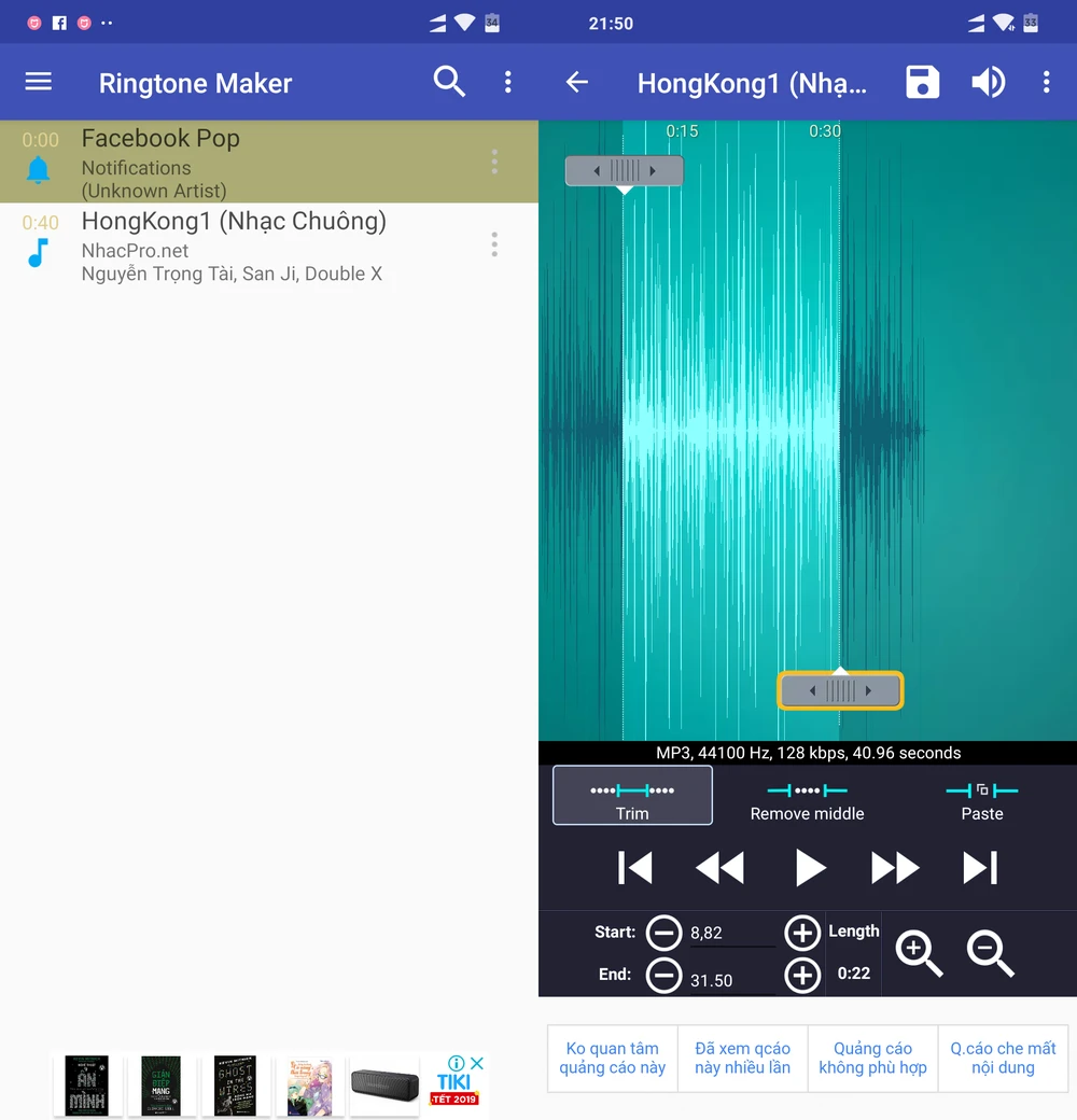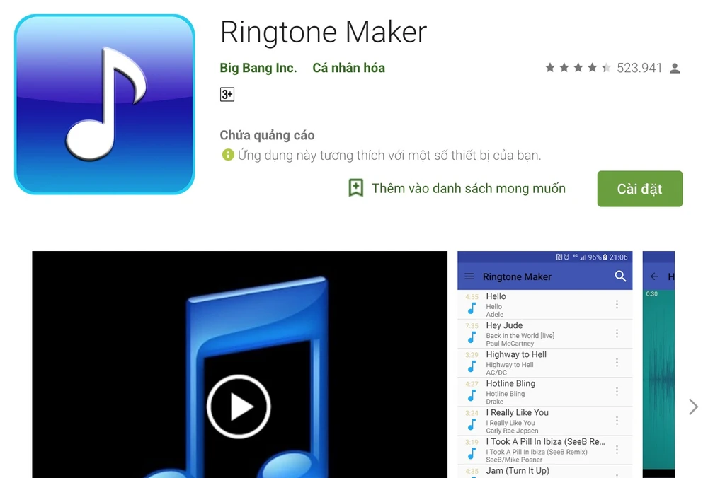 Nếu muốn chọn một đoạn nhạc tùy ý trong bài hát (có thể là điệp khúc), bạn cần phải cài đặt ứng dụng Ringtone Maker tại địa chỉ http://bit.ly/tao-nhac-chuong, tương thích với các thiết bị Android.