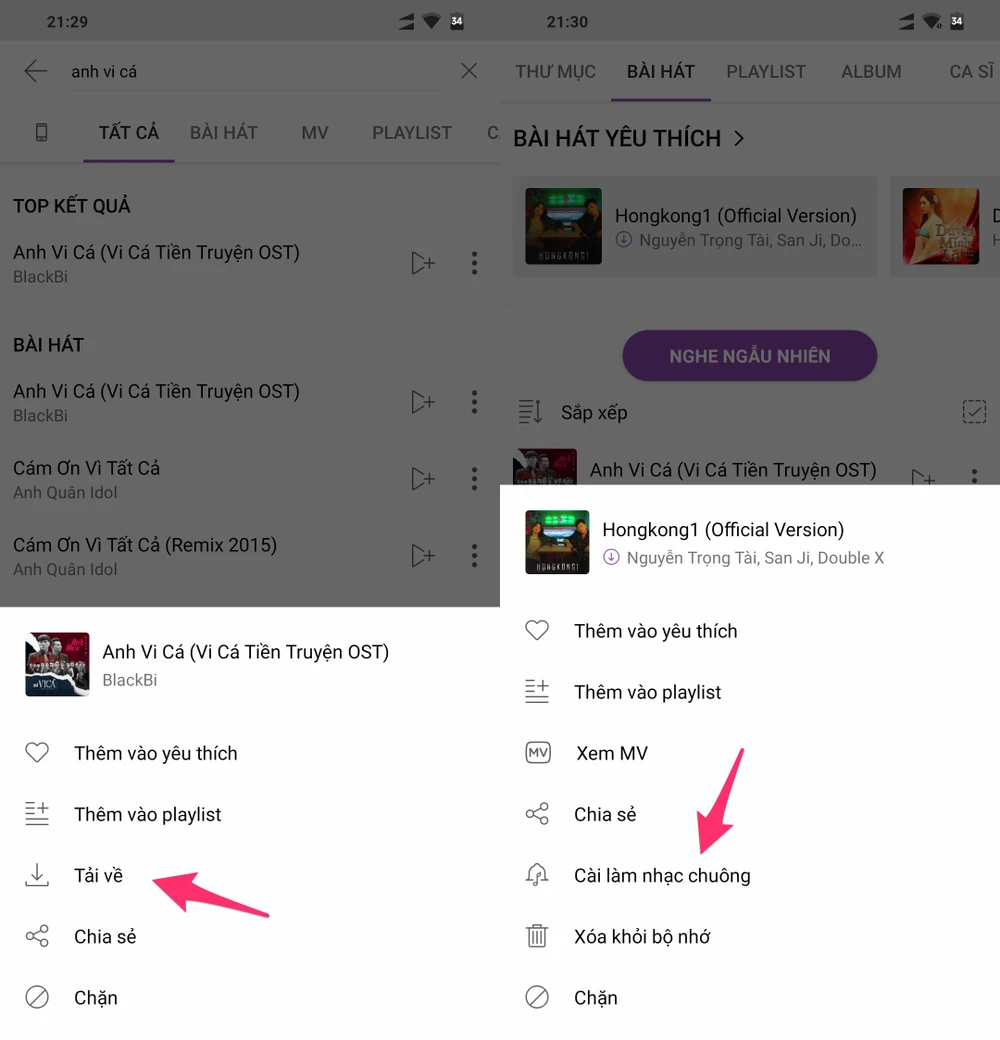 Khi hoàn tất, bạn hãy mở ứng dụng và tải về bài hát yêu thích. Sau đó, chuyển sang mục Cá nhân > Bài hát, bấm vào biểu tượng ba chấm ở góc phải và chọn Cài làm nhạc chuông.