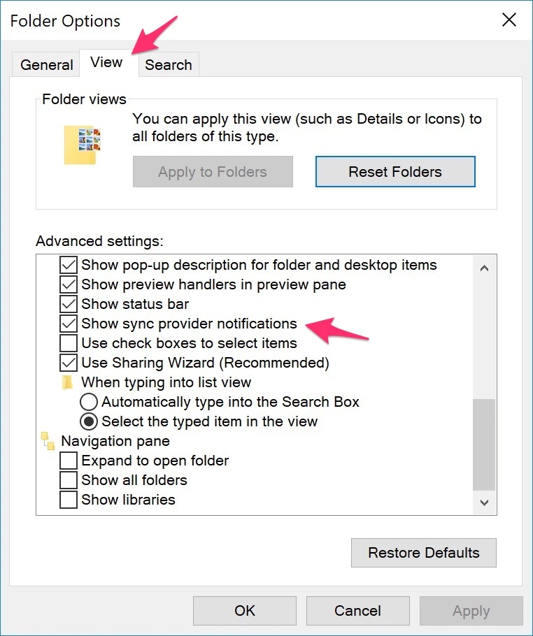 - Bước 2: Tiếp theo, người dùng chỉ cần chuyển sang thẻ View, kéo xuống bên dưới và vô hiệu hóa tùy chọn Show sync provider notifications. Cuối cùng, nhấn Apply > OK để lưu lại các thiết lập. Lúc này, toàn bộ quảng cáo bên trong Windows Explorer sẽ hoàn toàn biến mất.