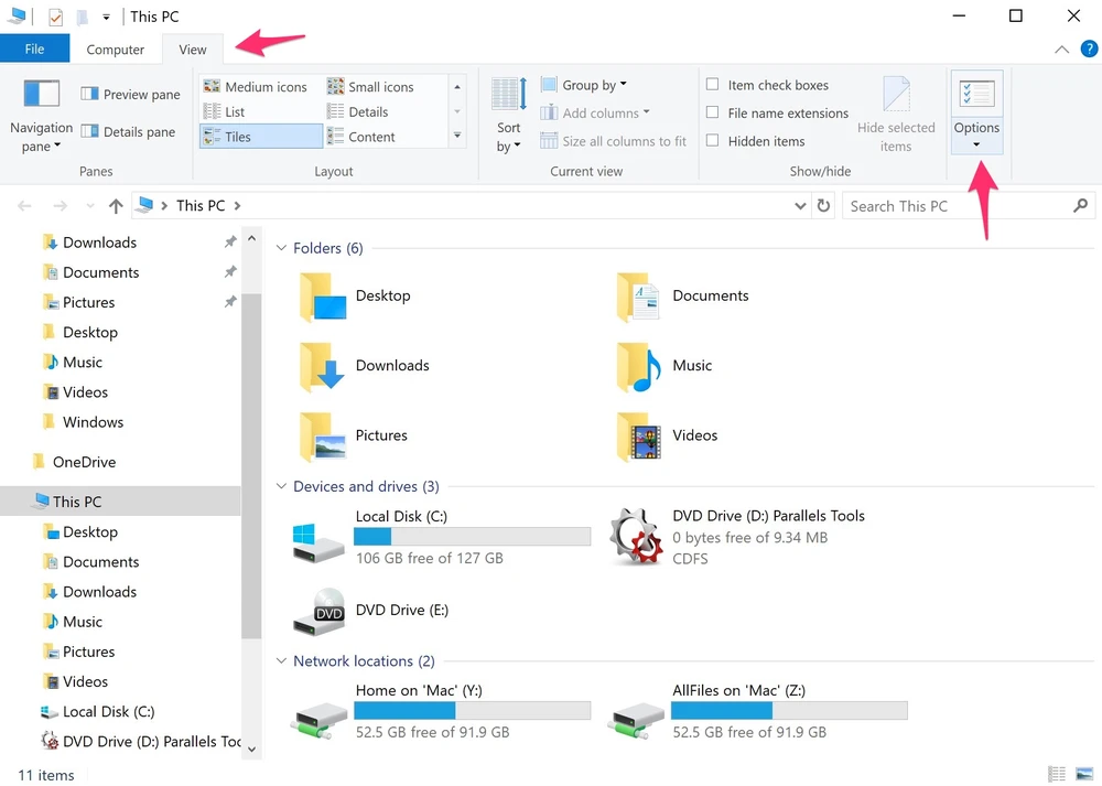 - Bước 1: Đầu tiên, bạn hãy mở Windows Explorer bằng cách nhấn tổ hợp phím Windows + E, sau đó, bấm vào biểu tượng mũi tên ở góc trên bên phải để mở bảng điều khiển, chuyển sang thẻ View > Options. Thông thường, quảng cáo sẽ có xu hướng giới thiệu về OneDrive, MS Office và các sản phẩm của Microsoft.