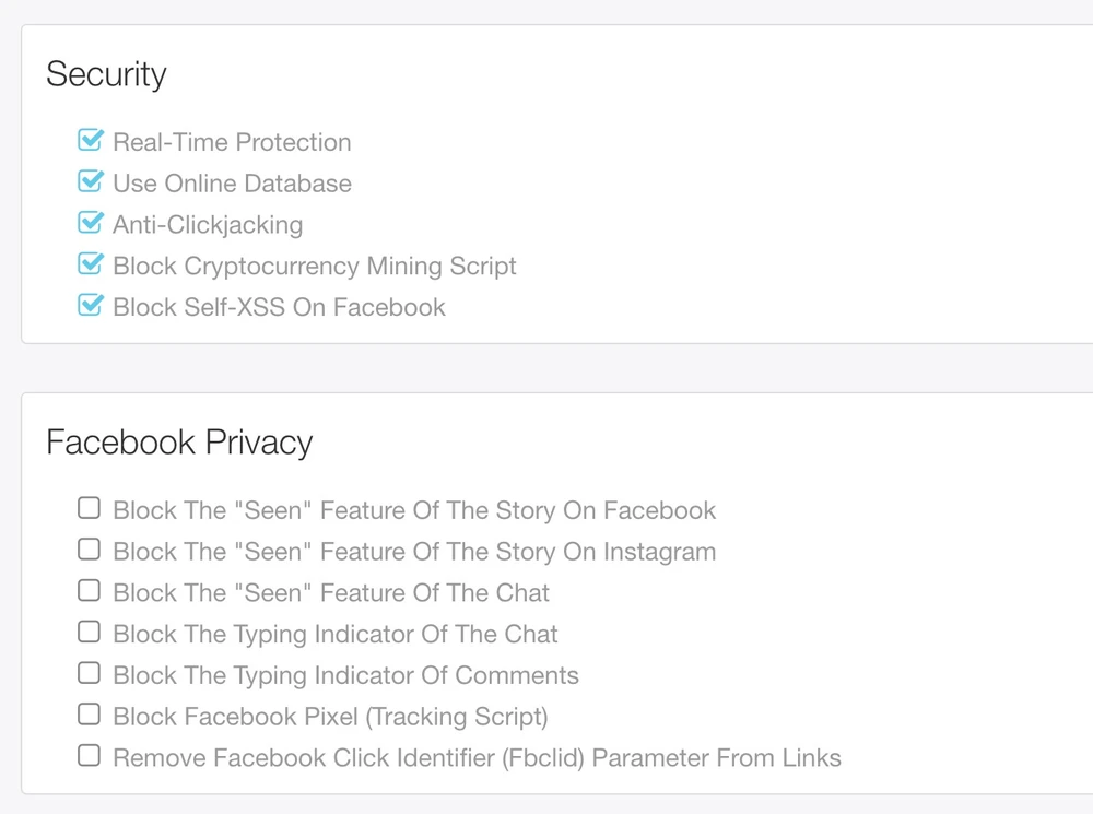 Ngoài việc bảo vệ người dùng Facebook khỏi các trò lừa đảo, tiện ích còn cung cấp khá nhiều tính năng đi kèm như tắt thông báo "đã xem", hiển thị thời gian sử dụng Facebook, chuyển Facebook sang dark mode (chế độ tối)...