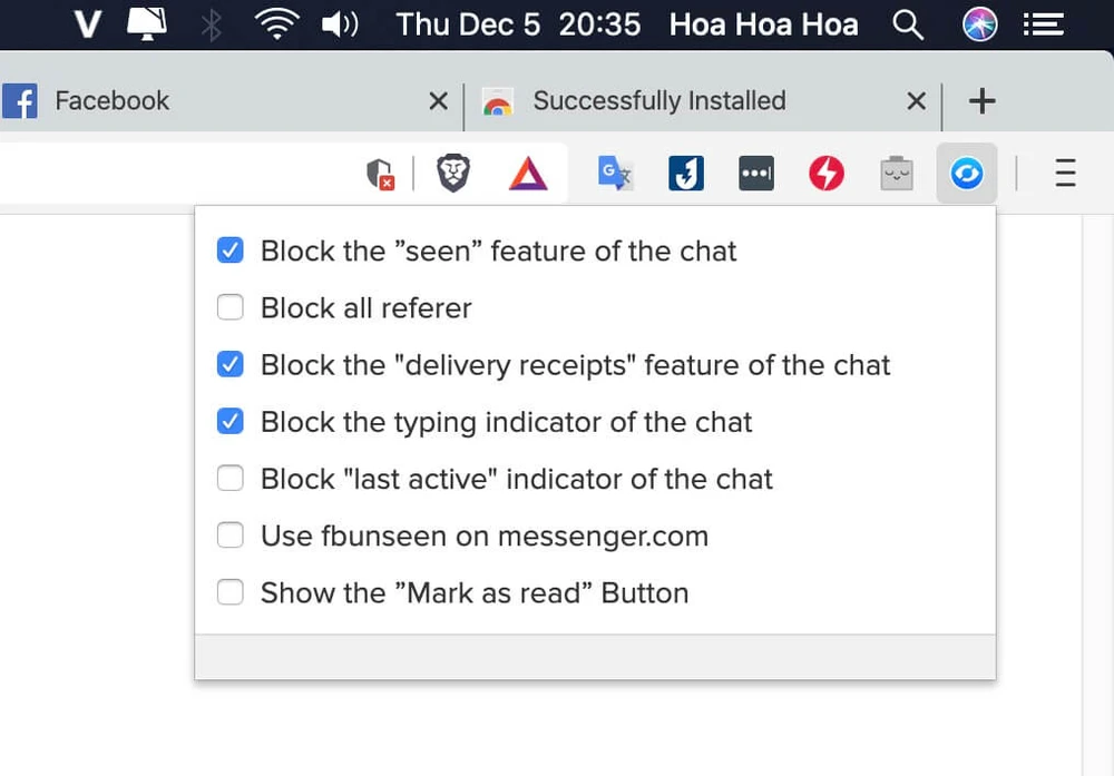 Khi hoàn tất, người dùng chỉ cần nhấp vào biểu tượng của tiện ích ở cuối thanh địa chỉ, sau đó đánh dấu chọn vào các mục Block the “seen” feature of the chat (tắt tính năng đã xem), Block the typing indicator of the chat (chặn biểu tượng đang nhập tin nhắn)… và một số tùy chọn khác mà bạn có thể tìm hiểu thêm trong quá trình sử dụng.