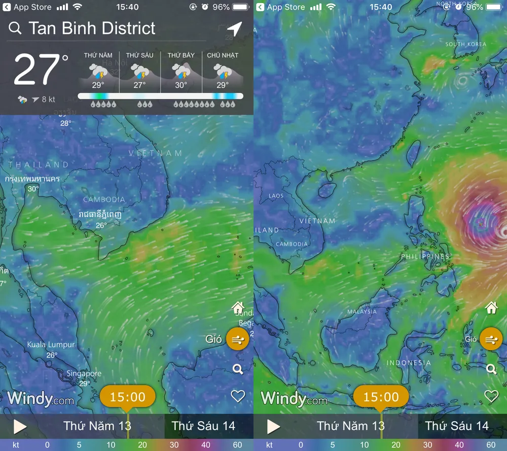Giao diện chính của ứng dụng sẽ hiển thị tâm bão và các thông tin liên quan như sức gió, lượng mưa, nhiệt độ… Dựa vào thang đo ở góc phải, người dùng có thể tự phân tích tình hình thời tiết tại khu vực đang sinh sống. Trong phần menu của Windy, bạn có thể thay đổi thông tin cần theo dõi như nhiệt độ, mây-mưa, sóng, áp suất… Để theo dõi đường đi của siêu bão trong những ngày tiếp theo, bạn chỉ cần bấm vào thanh thời gian ở dưới màn hình.