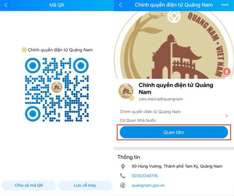 Để truy cập vào trang Zalo “Chính quyền điện tử Quảng Nam”, người dùng Zalo cần nhập “Chính quyền điện tử Quảng Nam” trên ô tìm kiếm của ứng dụng hoặc quét mã QR bên dưới và bấm nút quan tâm.