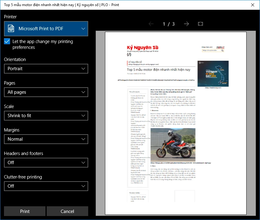 Đầu tiên, bạn hãy mở bài viết cần in bằng trình duyệt Microsoft Edge, nhấn vào biểu tượng ba chấm ở góc trên bên phải và chọn Print hoặc nhấn tổ hợp phím Ctrl + P. Tại màn hình xem trước bản in (Print preview), bạn sẽ thấy xuất hiện thêm tùy chọn Clutter-free printing ở ngay bên dưới, mặc định tính năng này sẽ chưa được kích hoạt. Bản in lúc này trông khá rối rắm vì dính nhiều thành phần dư thừa.