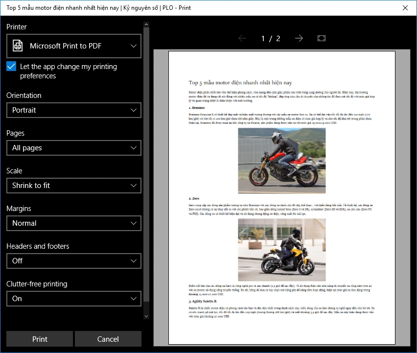 Để giải quyết vấn đề trên, bạn chỉ cần bật tính năng Clutter-free printing thành On, ngay lập tức các thành phần không cần thiết như quảng cáo, thanh điều hướng… sẽ bị loại bỏ hoàn toàn như hình bên dưới. Mặc định, số lượng trang in ban đầu là 11 trang, tuy nhiên sau khi bật tính năng Clutter-free printing, kết quả giảm xuống chỉ còn bảy trang (tiết kiệm khoảng 30% chi phí).