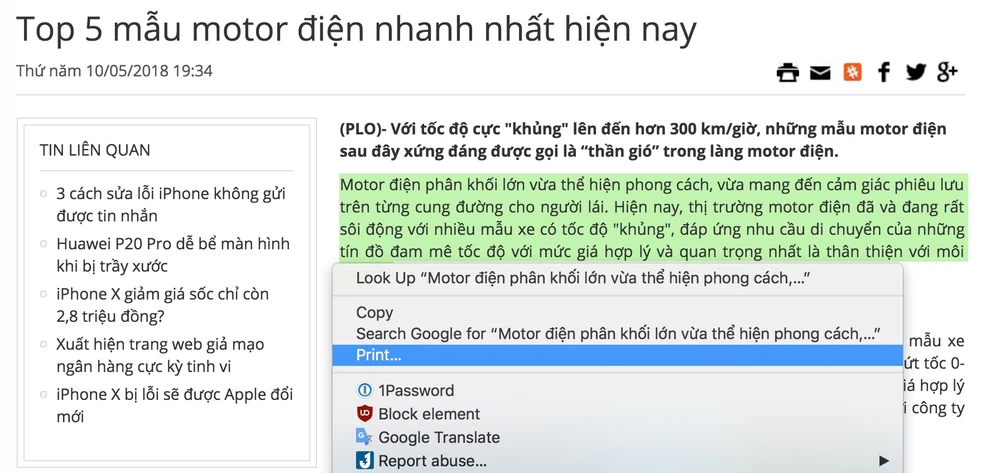 Bên cạnh đó, người dùng còn có thể chọn in một đoạn văn bản bất kỳ thay vì toàn trang. Tính năng này vốn không phải là mới, tuy nhiên mỗi trình duyệt lại có thao tác thực hiện khác nhau.