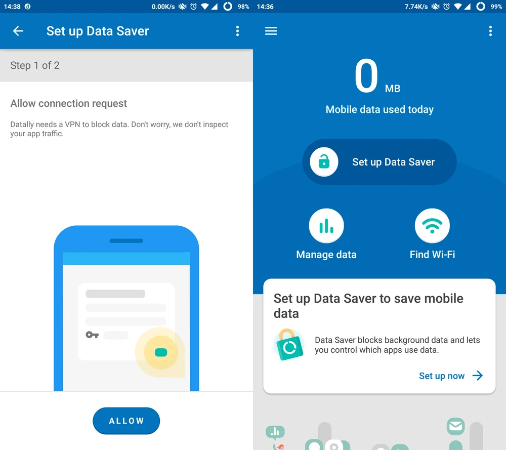 - Bước 2: Tiếp theo, bạn hãy bấm vào nút Set up now > Allow để thiết lập một vài thông số trước khi sử dụng. Giao diện của Datally khá đơn giản chỉ với hai mục chính gồm Manage data (quản lý dữ liệu) và Find WiFi (tìm điểm kết nối Internet).