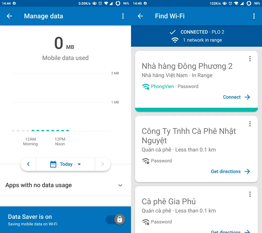 - Bước 4: Tương tự, để tìm kiếm các điểm kết nối WiFi xung quanh, bạn hãy bấm vào tùy chọn Find Wi-Fi, lúc này Datally sẽ gợi ý một số điểm truy cập gần nhất với địa chỉ và khoảng cách tương ứng.