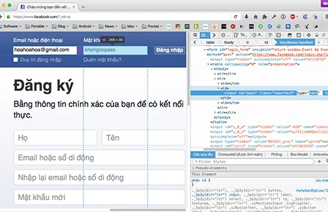 Khi xảy ra tình trạng quên mật khẩu bạn có thể không cần phải cài thêm các tiện ích mở rộng hoặc trả lời câu hỏi bảo mật để khôi phục mật khẩu. Bạn chỉ cần bấm phải chuột vào ô mật khẩu và chọn Kiểm tra đối tượng HTML (đối với trình duyệt Firefox), nếu đang sử dụng Google Chrome (hoặc Cốc Cốc) thì chọn Inspect Element, lúc này trình duyệt sẽ tự động mở ra một cửa sổ có chứa nhiều đoạn code tương ứng với những thành phần trên trang. Ngay tại dòng đang được tô đậm, bạn hãy đổi thuộc tính password của mục type thành text và ngay lập tức mật khẩu ẩn dưới dấu tròn hoặc sao sẽ được hiển thị.