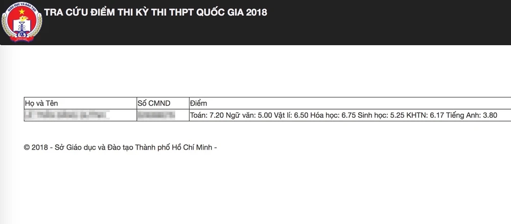 Tra cứu điểm thi của một thí sinh thuộc khu vực TP.HCM. Ảnh: TIỂU MINH