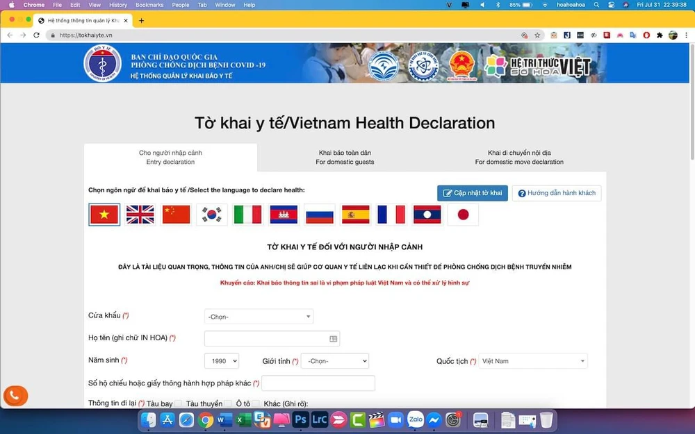 Người dùng chỉ cần điền đầy đủ các thông tin như tên cửa khẩu, họ tên, năm sinh, giới tính, quốc tịch, thông tin đi lại (máy bay, tàu xe) và các triệu chứng như ho, sốt, khó thở... (nếu có). Toàn bộ thông tin từ tờ khai sẽ được hệ thống cập nhật về những trung tâm chống dịch và cơ quan của Việt Nam để quản lý.