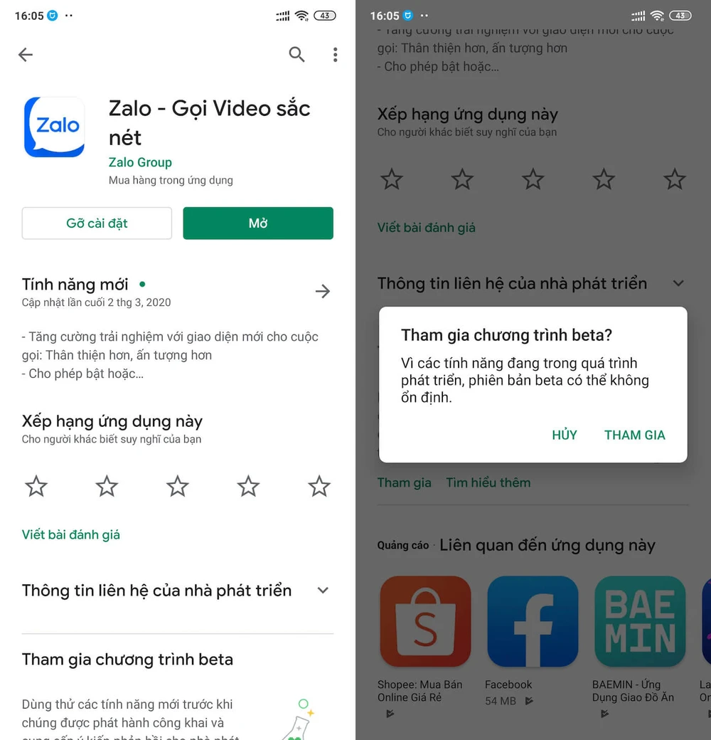 Tiếp theo, bạn hãy mở Google Play, gõ từ khóa Zalo vào khung tìm kiếm. Kéo xuống bên dưới và tìm đến mục Tham gia chương trình Beta - Tham gia, chờ vài phút để hoàn tất quá trình đăng ký. Lưu ý, trong trường hợp chờ quá lâu, người dùng chỉ cần tắt Google Play và mở lại.