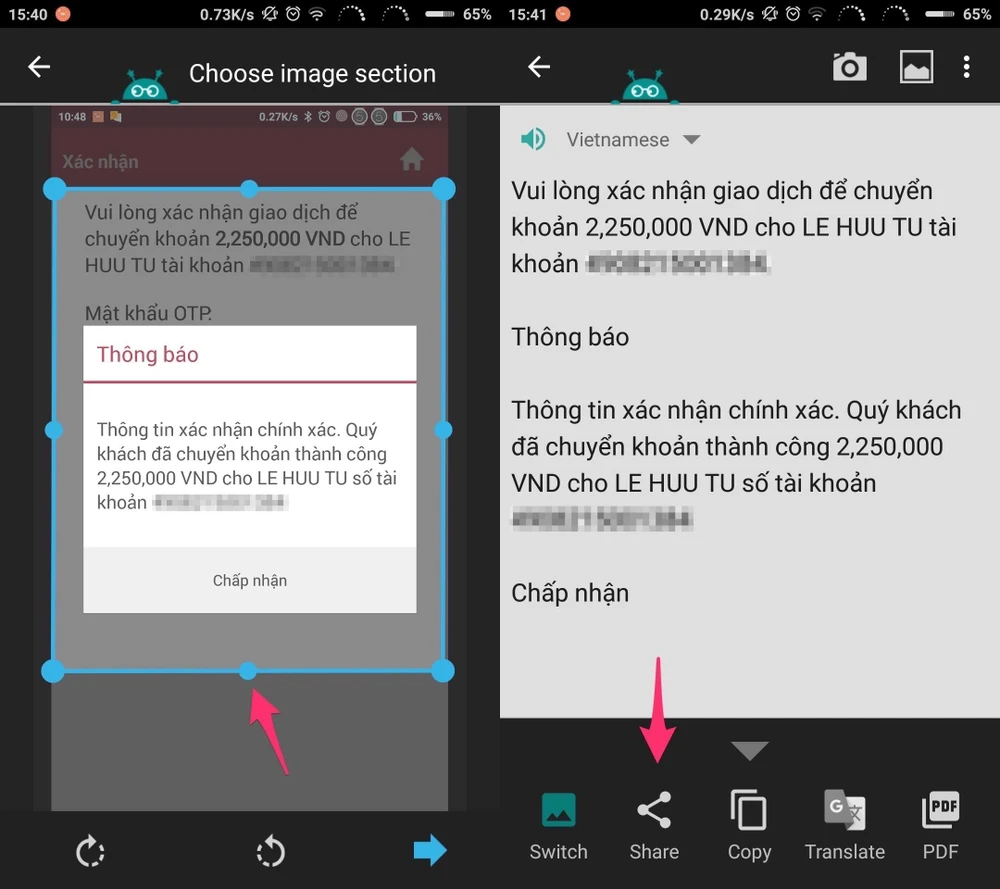 - Bước 4: Tiếp theo, bạn cần thiết lập khu vực chứa vắn bản cần lấy rồi nhấn vào biểu tượng mũi tên, sau đó lựa chọn ngôn ngữ tương ứng và chờ một lát để quá trình trích xuất hoàn tất.