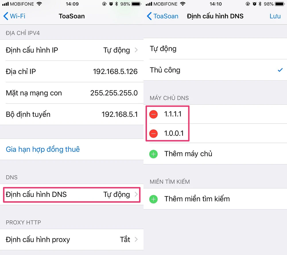 Đầu tiên, bạn hãy truy cập vào phần Settings (cài đặt) > WiFi, bấm vào biểu tượng chữ “i” tại kết nối đang sử dụng. Tiếp theo, kéo xuống bên dưới mục Configure DNS (cấu hình DNS) > Manual (thủ công), xóa các máy chủ DNS cũ. Sau đó, người dùng chỉ cần nhấn Add server (thêm máy chủ), nhập vào 1.1.1.1 và 1.0.0.1, nhấn Save để lưu lại.