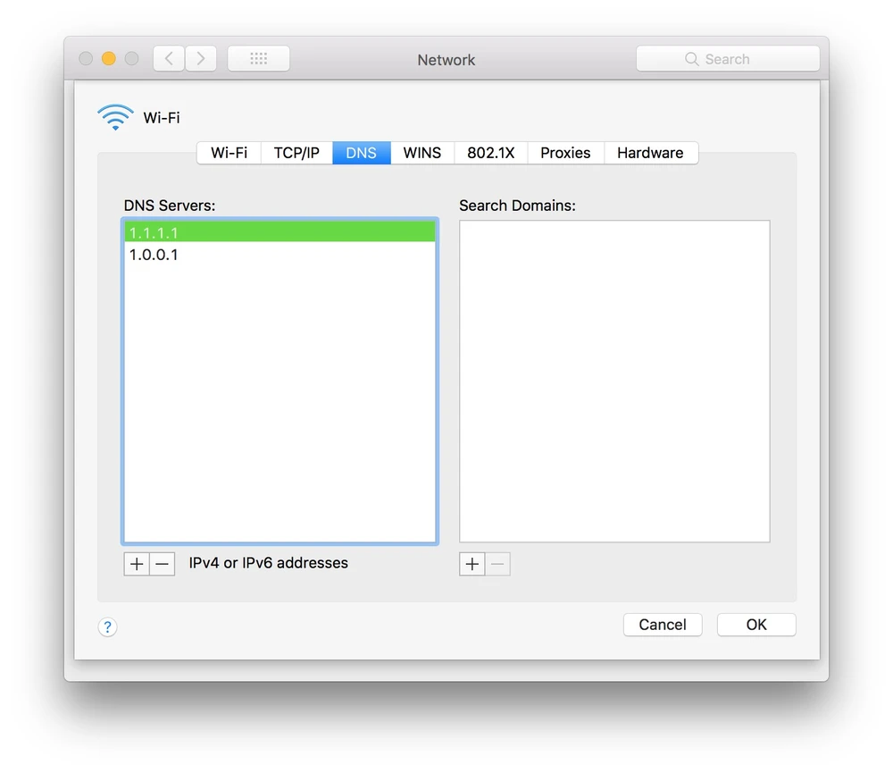 Đầu tiên, bạn hãy bấm vào biểu tượng WiFi ở góc phải màn hình và chọn Open Network Preferences. Trong cửa sổ mới hiện ra, người dùng chỉ cần chọn Wi-Fi > Advanced > DNS, nhấn vào biểu tượng dấu cộng, nhập 1.1.1.1 và 1.0.0.1 rồi nhấn OK > Apply để lưu lại. Lưu ý, nếu đã thêm DNS trước đó, người dùng cần phải bấm chọn rồi nhấn vào biểu tượng dấu trừ để xóa bỏ.