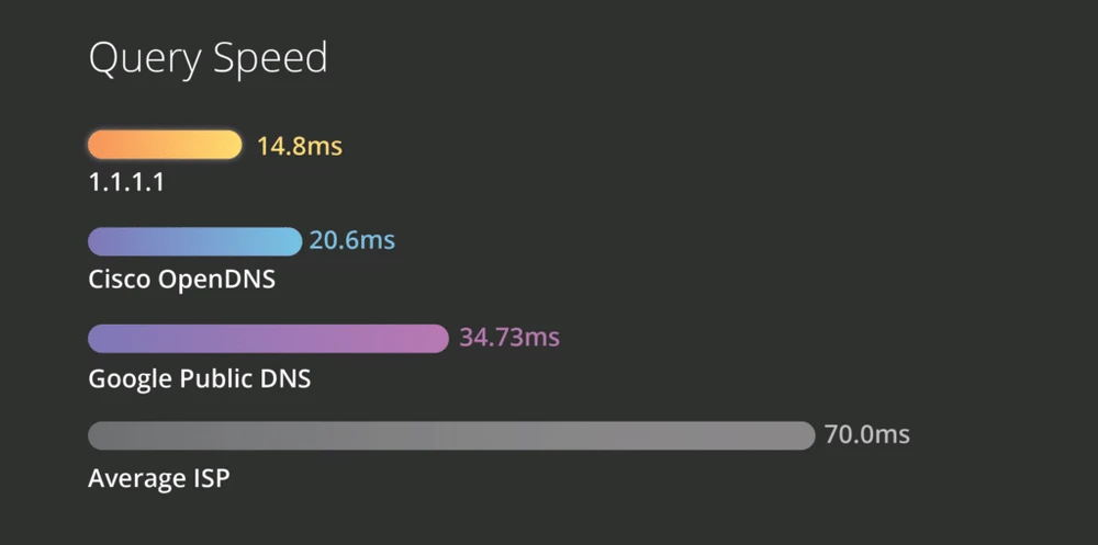 Trong bài kiểm tra tốc độ truy cập Internet, DNS của Cloudflare cho tốc độ nhỉnh hơn so với Cisco OpenDNS, Google Public DNS và DNS mặc định của nhà cung cấp dịch vụ Internet (FPT, Viettel, VNPT…). Ngoài ra, việc sử dụng Cloudflare DNS còn giúp bảo mật thông tin, đồng thời khắc phục những nhược điểm còn tồn tại trên các dịch vụ DNS khác.