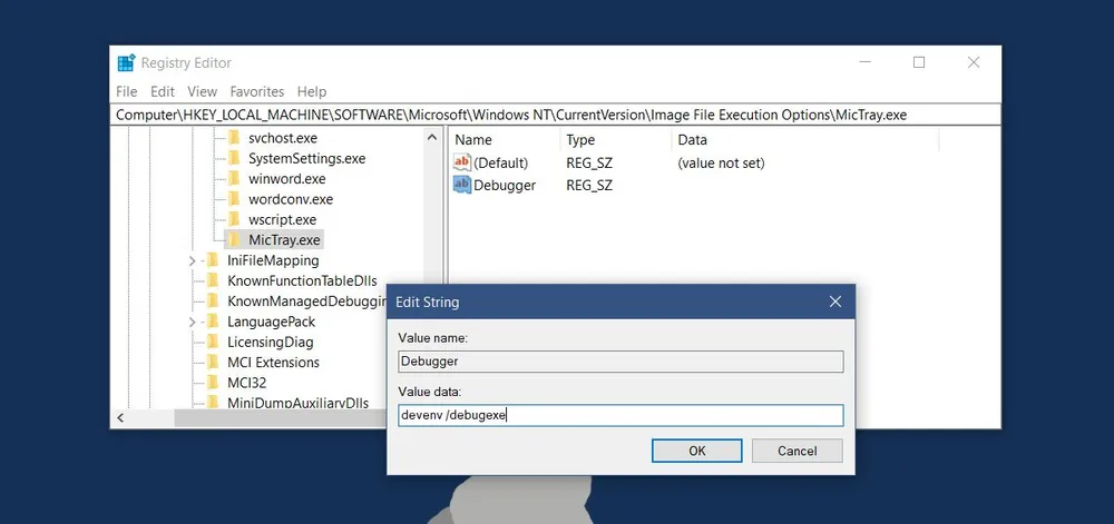 - Bước 3: Kích phải chuột lên khóa mới tạo, chọn New > String Value và đặt tên là Debugger. Tiếp theo, bạn hãy kích đúp vào chuỗi giá trị Debugger và nhập devenv /debugexe vào khung Value data.