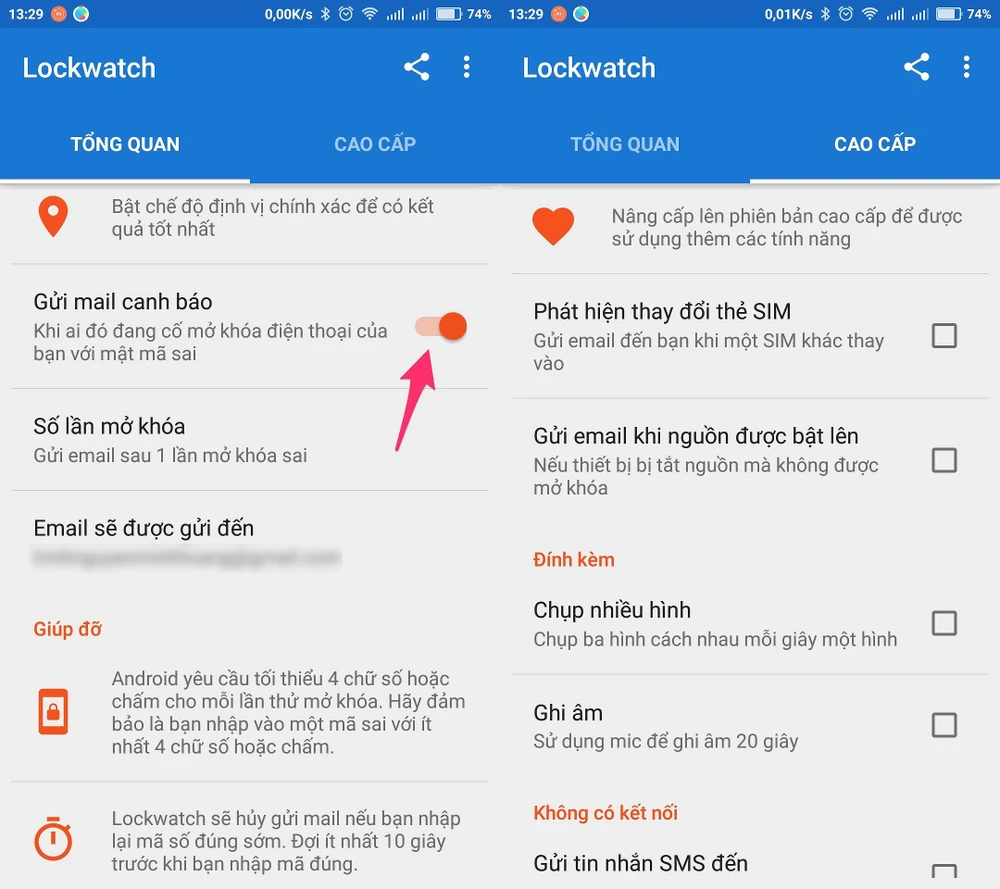 - Bước 3: Mặc định, ứng dụng sẽ gửi thông tin của kẻ trộm đến email khi họ mở khóa sai một lần. Nếu muốn điều chỉnh lại thông số trên, bạn chỉ cần bấm vào mục Number of unlock attempts (số lần mở khóa). Lưu ý, email có thể bị đưa vào thư mục Spam, do đó, bạn cần kiểm tra thật kĩ mọi thứ và đánh dấu email là Not Spam (không phải thư rác).