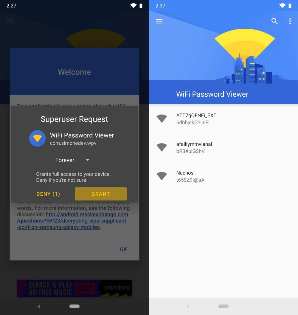 Khi chạy WiFi Password Viewer lần đầu tiên, ứng dụng sẽ yêu cầu quyền truy cập Superuser, việc bạn cần làm là nhấp vào tùy chọn Grant để cấp quyền.