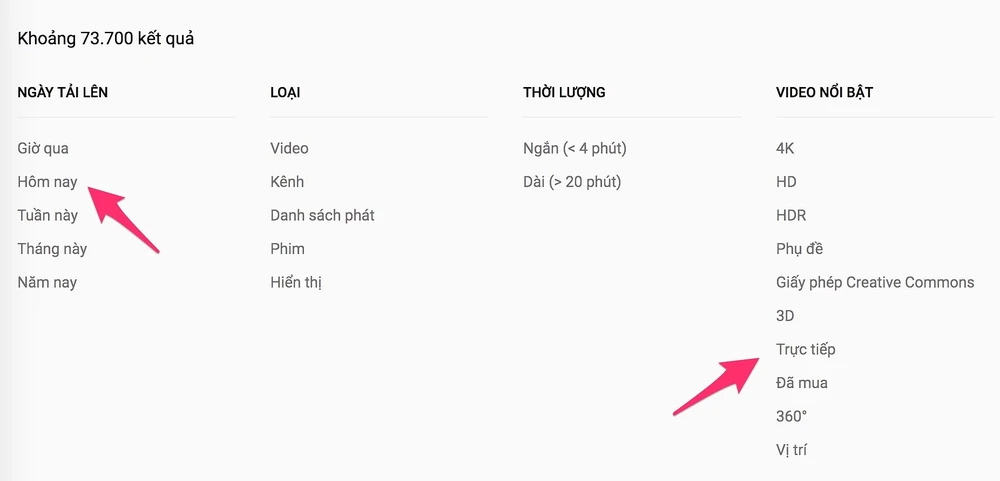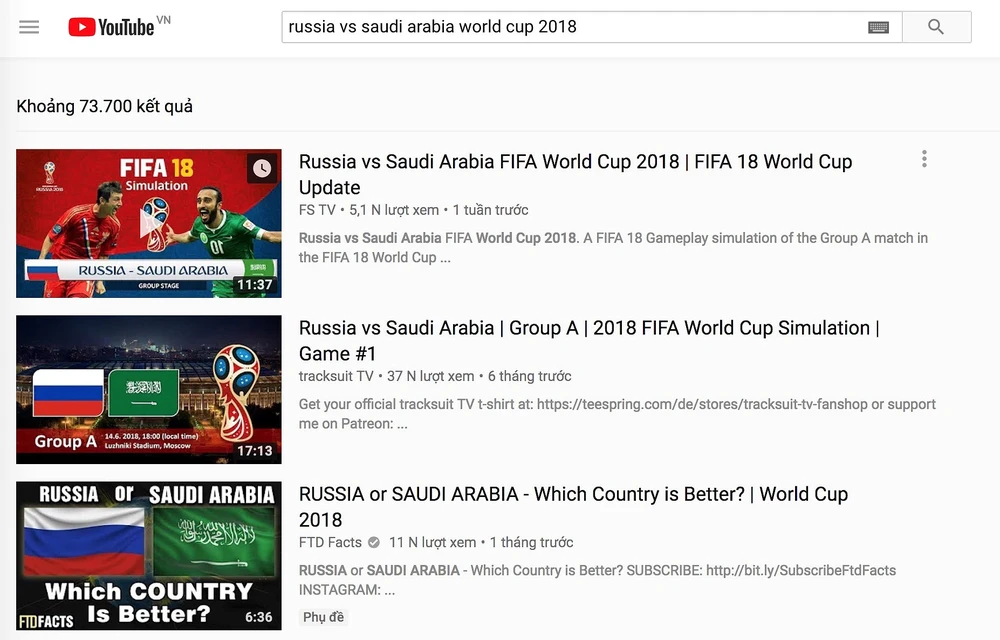 Tuy nhiên, sẽ có rất nhiều kết quả không chính xác hiện ra, lúc này bạn cần nhấn vào phần bộ lọc ở góc trên bên phải và chọn thời gian là hôm nay, phần video nổi bật sẽ thiết lập là trực tiếp để có thể xem trực tiếp World Cup 2018. Lưu ý, nếu YouTube có thể giúp bạn xem trực tiếp World Cup 2018 thì Facebook cũng không ngoại lệ. Tương tự, bạn chỉ cần gõ từ khóa tên đội bóng + vs + tên đội bóng + World Cup 2018 + live sẽ cho ra kết quả theo ý muốn.