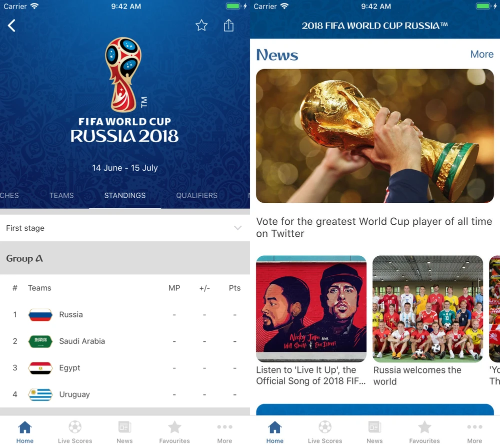 World Cup 2018 cũng là một ứng dụng bạn không nên bỏ qua. Ứng dụng có giao diện trực quan, cung cấp các thông tin về lịch thi đấu, trận đấu và bảng đấu. Người dùng có thể cập nhật những thông tin về thời gian, địa điểm, đội tham gia… theo thời gian thực. Nếu chỉ muốn cập nhật thông tin trận đấu từ những đội bóng yêu thích, ứng dụng World Cup 2018 cũng hỗ thực hiện điều này thông qua các tùy chỉnh bên trong ứng dụng. Tải World Cup 2018 tại địa chỉ https://apple.co/2HFQI6c (iOS) hoặc http://bit.ly/2HHpzzQ (Android).