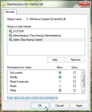Nhấn phải chuột lên tập tin đó và chọn Properties, chuyển qua thẻ Security > Advanced, tiếp tục chuyển sang thẻ Owner > Edit, sau đó bạn thêm vào tài khoản mà bạn đang sử dụng ở khung Enter the object name to select rồi nhấn OK.