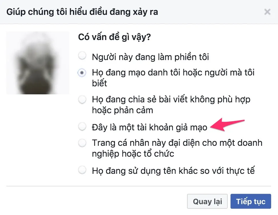 - Bước 2: Tại đây, bạn có một số tùy chọn để sử dụng gồm This person is annoying me (người này đang làm phiền tôi), They're pretending to be me or someone I know (họ đang mạo danh tôi hoặc người mà tôi biết), This is a fake account (đây là một tài khoản giả mạo)… Tùy vào mỗi trường hợp mà bạn cần lựa chọn cho chính xác.