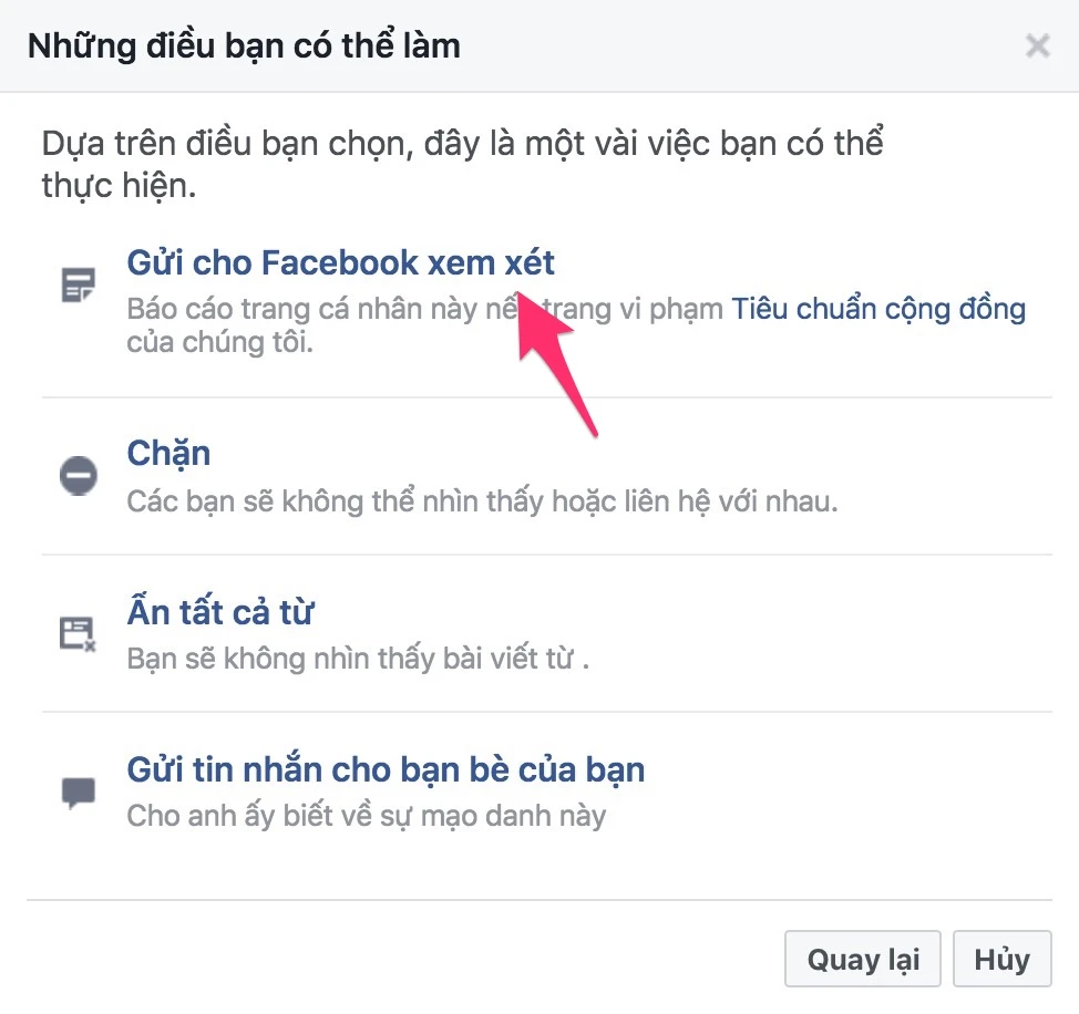 - Bước 3: Lúc này người dùng có thể chọn Submit to Facebook for Review (gửi cho Facebook xem xét), Block (ngăn chặn) hoặc Message your friend (gửi tin nhắn cho bạn bè của bạn) để cảnh báo.