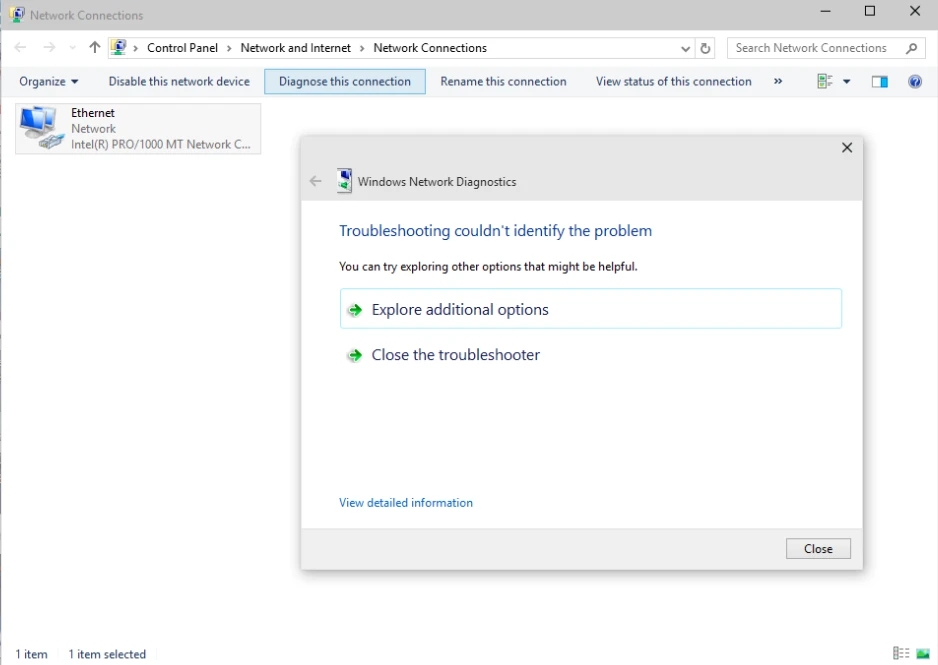Cách đơn giản nhất để xử lý là nhấp phải chuột vào biểu tượng mạng ở khay hệ thống và chọn Open Network and Sharing Center > Change adapter settings, chọn vào kết nối mà bạn đang sử dụng (Ethernet hoặc Wi-Fi), sau đó kích vào mục Diagnose this connection ở thanh menu bên trên, chờ nó xử lý rồi nhấn Apply để hoàn tất.