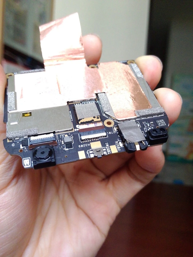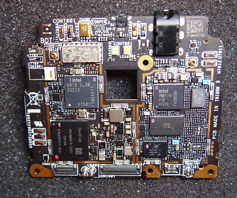 Bo mạch mặt trước bao gồm: 1. Intel PMB9933 P10 C XG726G H1450 F450A513 (Baseband, XMM 7260) (chip xử lý băng tần 4G) 2. BROADCOM BCM4339XKUBG (chip WiFi) 3. Intel PMB6830 P10 H1448 F4486902 (PM IC) (IC nguồn) 4. SK hynix H9CKNNNCPTMR PRNUH 501A (vi xử lýIntel Atom Z3560 64-bit cùng RAM 4GB) 5. Winbond W978H6KBVX2E 6. SKY77597-11 (TxRx FEM)