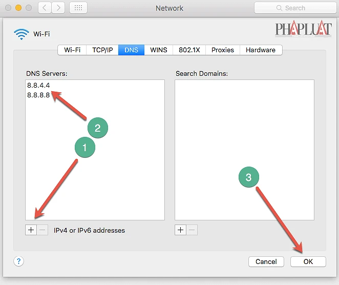 - Mac: Để thay đổi DNS trên Mac, bạn bấm vào biểu tượng Wi-Fi trên thanh thông báo, chọn Open Network Preferences > Advanced > DNS. Tiếp theo, bạn hãy kích vào biểu tượng dấu cộng, nhập đầy đủ các thông tin tương ứng và nhấn Apply để lưu lại. Lưu ý, nếu thấy tốc độ chưa cải thiện, bạn có thể đổi sang một nhà cung cấp DNS khác hoặc xem thêm các thủ thuật tiếp theo.