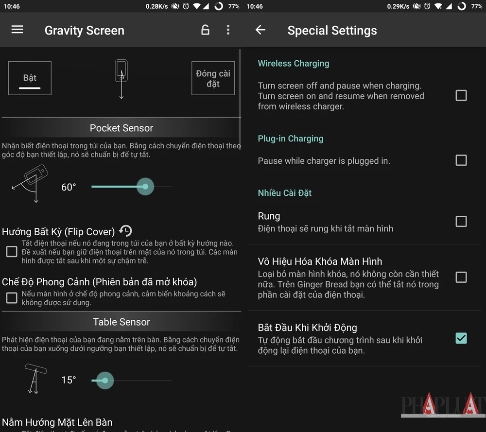 Tiếp theo, bạn hãy cài đặt ứng dụng Gravity Screen cho smartphone tại địa chỉ https://goo.gl/z9A3S, tương thích với các thiết bị Android 2.3.3 trở lên. Về cơ bản, ứng dụng này sẽ tận dụng các cảm biến có sẵn trên smartphone như cảm biến ánh sáng, tiệm cận, trọng lực... để thực hiện nhiều chức năng mà không cần bấm phím, khá hữu ích khi nút nguồn trên smartphone bị hư hỏng hoặc kém nhạy.