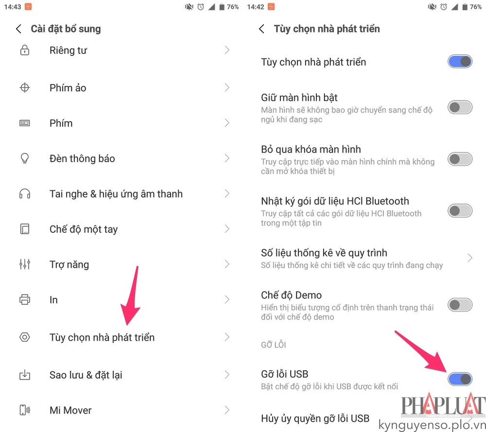 Đầu tiên, bạn cần phải bật chế độ USB debugging trên Android bằng cách truy cập vào Settings (cài đặt) > About phone (thông tin điện thoại), chạm 7 lần vào mục Build number (số hiệu phiên bản) cho đến khi xuất hiện thông báo You're developer (bạn đã là nhà phát triển). Lúc này, người dùng hãy quay trở về menu trước đó và chọn Developer options (tùy chọn nhà phát triển) > USB debugging (gỡ lỗi USB).