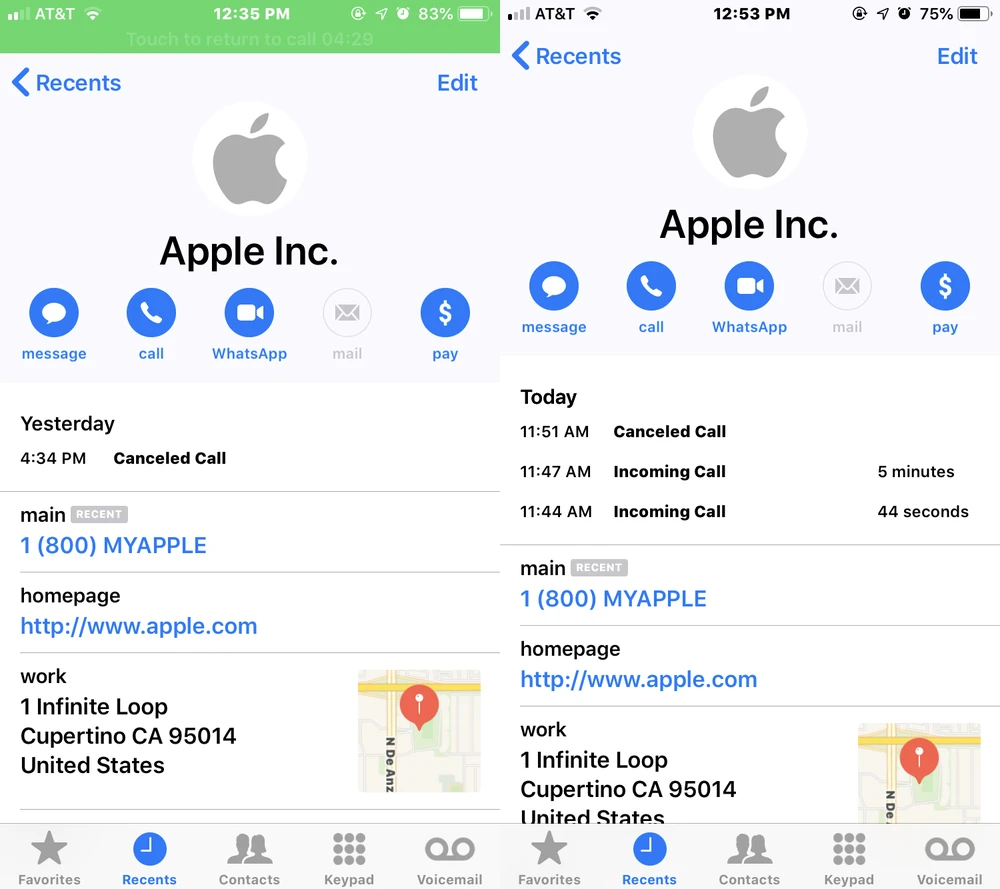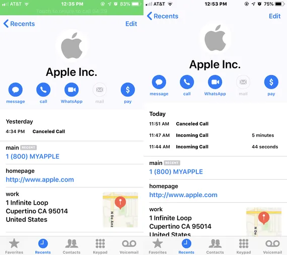 Trong trường hợp này, kẻ gian đã tạo ra một cuộc gọi tự động giả mạo có logo, địa chỉ và số điện thoại thật của Apple, ngoại trừ địa chỉ trang web là http thay vì https. Nếu bạn sử dụng iPhone, cuộc gọi giả mạo sẽ hiển thị trong mục Recent (gần đây) như một cuộc gọi hợp pháp từ Apple.