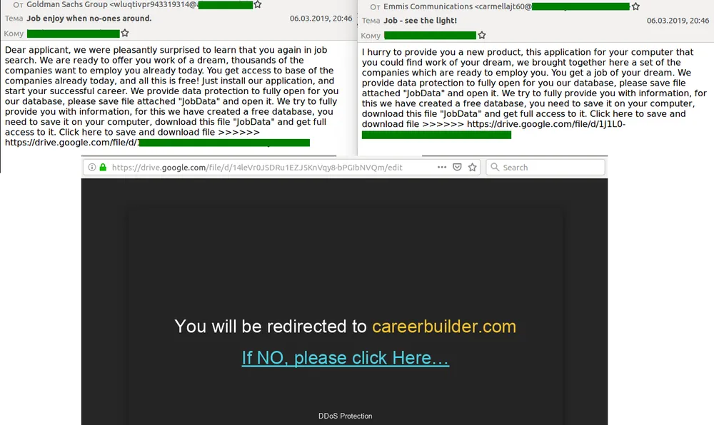 Để mọi việc trông đáng tin hơn, những kẻ tấn công đã thêm một cửa sổ mang dòng chữ “Bảo vệ khỏi Tấn công từ chối dịch vụ DDoS (DDoS Protection)” và một tin nhắn giả thông báo người dùng đang được chuyển hướng đến trang web của một trong những công ty tuyển dụng lớn nhất.