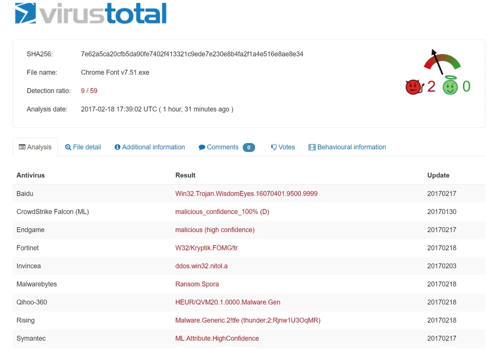 Khi kiểm tra tập tin bằng VirusTotal, kết quả trả về cho thấy có 9/59 công cụ bảo mật phát hiện có virus. Nếu bạn cài Chrome Font vào máy tính, nhiều khả năng tội phạm mạng có thể đánh cắp thông tin tài khoản Facebook, ngân hàng…