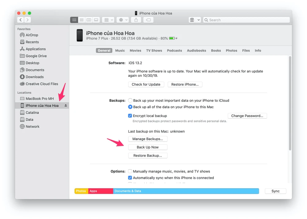 Tiếp theo, bạn bấm vào biểu tượng thiết bị ở góc trên bên trái, chọn This Computer - Back Up Now. Để tăng thêm phần bảo mật, người dùng chỉ cần đánh dấu chọn vào ô Encrypt iPhone backup. Điều này đồng nghĩa với việc toàn bộ dữ liệu nhạy cảm như mật khẩu, dữ liệu y tế, thiết bị HomeKit và thông tin đăng nhập cũng sẽ được sao lưu.