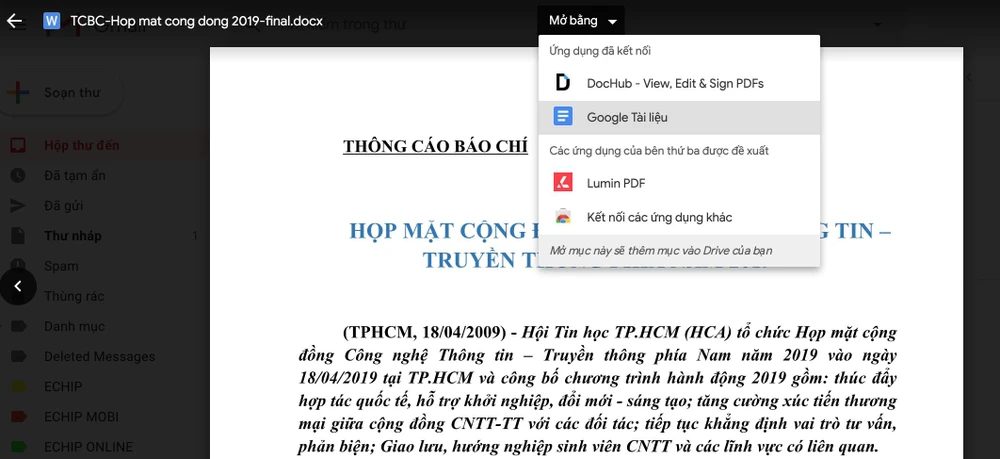Đối với những file tài liệu trong email, bạn hãy mở bằng Google Docs hoặc các ứng dụng chỉnh sửa tài liệu trực tuyến để tránh bị dính mã độc (nếu có).