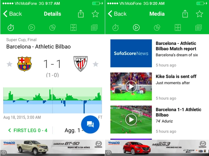 SofaScore là ứng dụng chuyên tra cứu lịch thi đấu, bảng xếp hạng của tất cả các giải đấu trên thế giới. Điểm đặc biệt là khả năng hỗ trợ nhiều môn thể thao bên cạnh bóng đá (football) như tennis (quần vợt), basketball (bóng rổ), volleyball (bóng chuyền), futsal, badminton (cầu lông),…