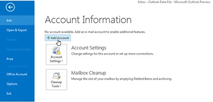 Bài viết dưới đây người viết sẽ thử nghiệm với chương trình Microsoft Outlook 2013 mới nhất hiện nay. Đầu tiên, bạn mở Microsoft Outlook 2013 lên rồi chọn vào menu File > Add Account.