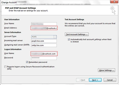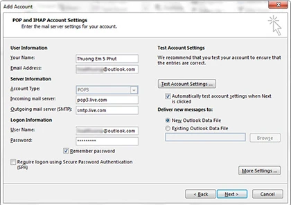 Mục Imcoming mail server sẽ điền là pop3.live.com và Outgoing mail server sẽ là smtp.live.com. Tại mục User Name bên dưới, bạn nhập vào giống như ở ô Email Address bên trên, lưu ý là phải có tên miền đầy đủ đằng sau (ví dụ là @outlook.com), sau đó nhập mật khẩu vào các ô bên dưới là được.