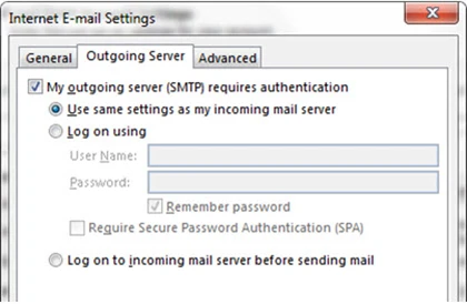 Tiếp theo, sau khi điền đầy đủ các thông tin, bạn tiếp tục kích chọn vào nút More Settings. Trên thẻ Outgoing Server, bạn đánh dấu chọn vào ô My outgoing server (SMTP) requires authentication và hãy chắc chắn rằng tùy chọn Use same settings as my incoming mail server đã được đánh dấu.