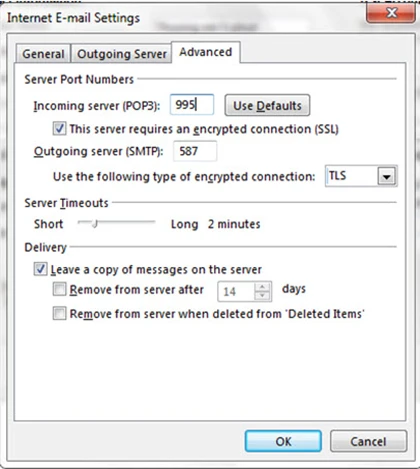 Nhập vào ô trống ở mục Outgoing server (SMTP) là 587, trong danh sách trình đơn được hiển thị, bạn chọn loại kết nối được mã hóa là TLS. Điều chỉnh thanh trượt ở mục Server Timeout tối thiểu là khoảng 2 phút. Khi thực hiện kết nối các tài khoản email với Microsoft Outlook thì nó sẽ tự động tải các email này về máy tính, và sau một khoảng thời gian thì các email trên server sẽ bị xóa đi.