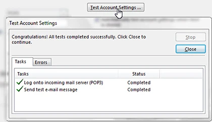 Cuối cùng nhấp OK để quay trở lại hộp thoại cấu hình. Bây giờ bạn kích chọn vào nút Test Account Settings để kiểm tra các thiết lập khi nãy. Ở giai đoạn này, Microsoft Outlook sẽ kiểm tra các thiết lập mà bạn đã nhập vào bằng cách cố gắng đăng nhập vào máy chủ và gửi thử một thông báo thử nghiệm. Nếu thành công, bạn sẽ nhận được một thông báo chúc mừng.