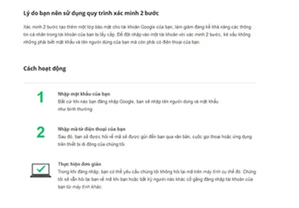 Bạn có thể làm theo quy trình kích hoạt bảo mật của Google bằng hướng dẫn tiếng Việt dễ dàng tại đường link sau đây: https://support.google.com/accounts/answer/180744?hl=vi.