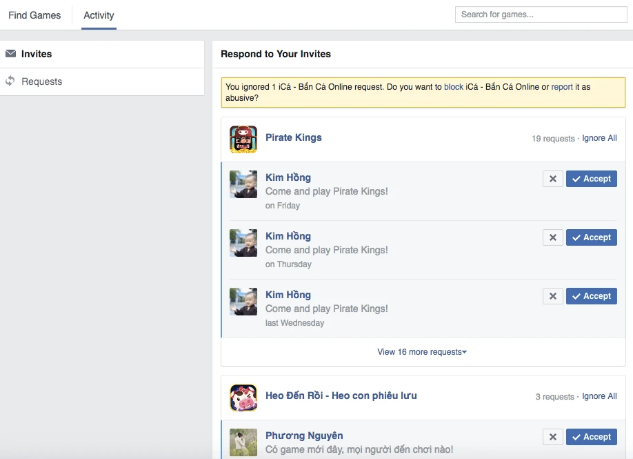- Bước 3: Chuyển sang thẻ Activity > Invites và nhấn Ignore All để bỏ qua tất cả lời mời chơi game.